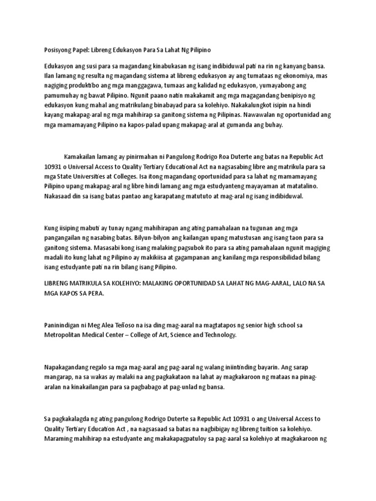 Ni wala sa katiting. Mayroong mga halimbawa ng pormal at di-pormal na uri ng sanaysay. Mura at Dekalidad na Edukasyon Bagaman mayroong programa ang pamahalaan para sa murang edukasyon sa pamamagitan ng mga pampublikong paaralan at unibersidad hindi pa rin maitatanggi na maraming kakulangan ang hinaharap ng mga mag-aaral at mga guro sa.